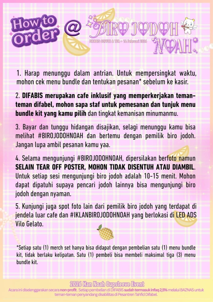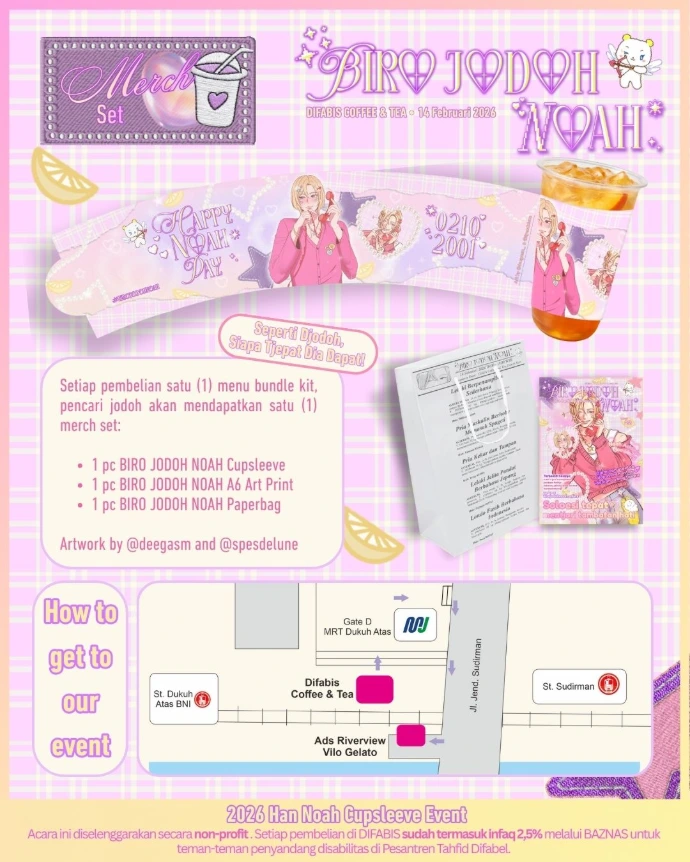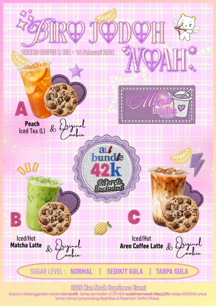 Kami penyelenggara acara BIRO JODOH NOAH dan IKLAN BIRO JODOH NOAH mengadakan acara ini secara NON-PROFIT dengan maksud merayakan ulang tahun member PLAVE Han Noah tahun 2026 bersama PLLI terutama di Jakarta bersama-sama dengan menyenangkan namun juga dengan DIFABIS Coffee & Tea kami mengajak PLLI berkontribusi dalam awareness dan donasi untuk teman-teman difabel. Setiap pembelian di DIFABIS Coffee & Tea sudah termasuk infaq 2,5% melalui BAZNAS untuk teman-teman penyandang disabilitas di Pesantren Tahfid Difabel.